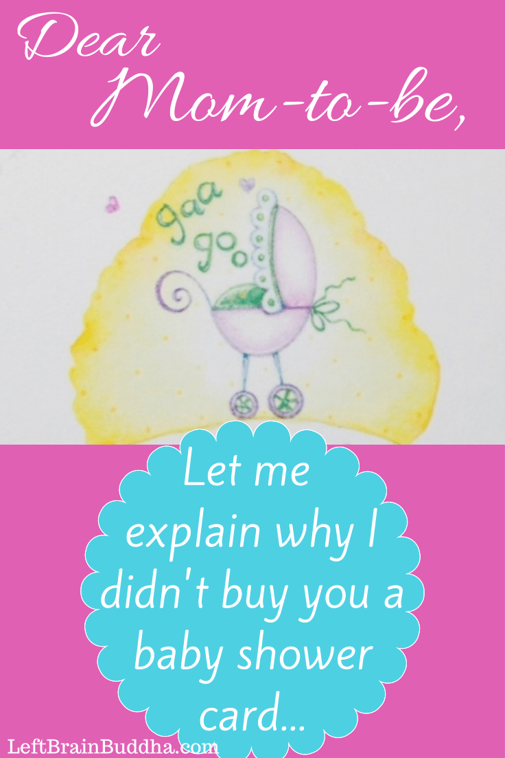 Perhaps you’re wondering why I didn’t purchase a card to accompany your baby shower gift. Perhaps you’re now fearing that parenthood makes you so impoverished that you can no longer afford even the cheapie cards from the $.99 aisle. Or maybe you’re worrying that “mommy brain” is real and you can’t believe I remembered a gift and the date and the location of your shower.